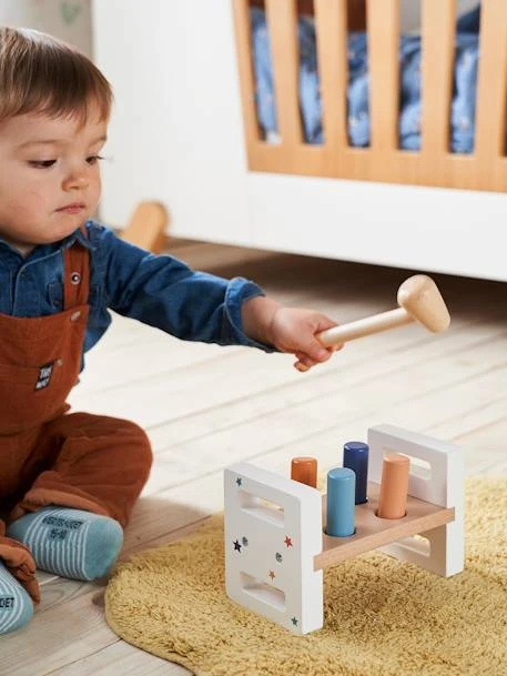 Un jeu de « tap-tap » avec lequel bébé pourra se défouler en toute sécurité ! Grâce au marteau, il devra se concentrer pour taper sur les cylindres pour les abaisser. Lorsqu’il a réussi, il suffit de retourner le banc et de recommencer !