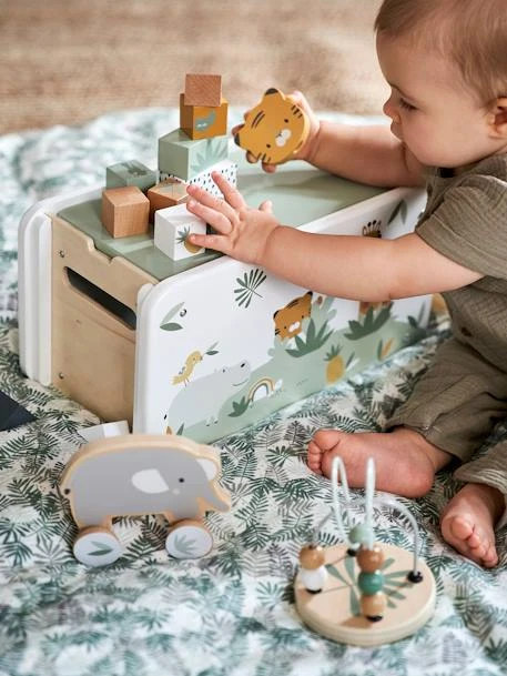 - Coffre comprenant 4 jouets d’éveil : – Pour le renard – un jeu de cubes, une pyramide, un renard à roulettes et un boulier à fils. – Pour Tanzanie – un jeu de cubes, une pyramide tigre, un éléphant à roulettes et un boulier à fils