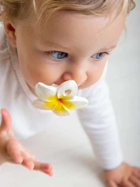 Plumeria ou frangipanier, cette jolie fleur tropicale est un jouet de dentition pour nouveau-né. Sa conception légère de forme ergonomique le rend facile à tenir et ses différentes textures aident à apaiser les gencives irritées des plus petits.
